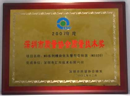 導語:匯川“MD系列模塊化矢量型變頻器(MD320)”項目榮獲2007年度深圳市質量協會質量技術獎