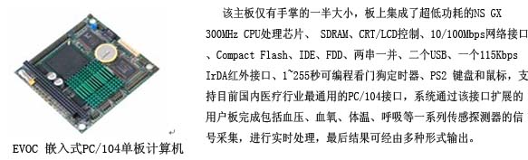 支持目前國內醫療行業最通用的PC/104接口,系統通過該接口擴展的用戶板完成包括心電血壓、血氧、體溫、呼吸等一系列傳感探測器的信號采集,進行實時處理,最后結果可經由多種形式輸出。