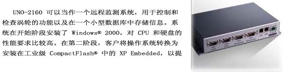 研華 UNO-2160 已經被成功應用在一套 5,600 兆瓦的風力發電系統中。可以用它來監視發電機的狀態,以及與現場的 PLC 設備和現場總線設備進行通訊。UNO-2160 與客戶的應用組合在一起,是一套緊湊、完整的高性能系統。