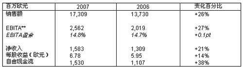 此外,運營增效和成本縮減計劃的初始影響也推動了盈利能力的顯著好轉。扣除非經常性費用之前的EBITA***在2007年總計達4.40億美元,超過了2006年數據的2倍,利潤率為12.5%,而前一年僅為6.9%。EBITA總計達到4.02億美元。