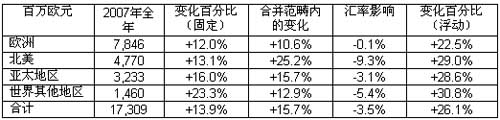 EBITA也在2007年有大幅增長,增長率為27%,達25.62億歐元。以下因素貢獻了3.57億歐元的自身增長額