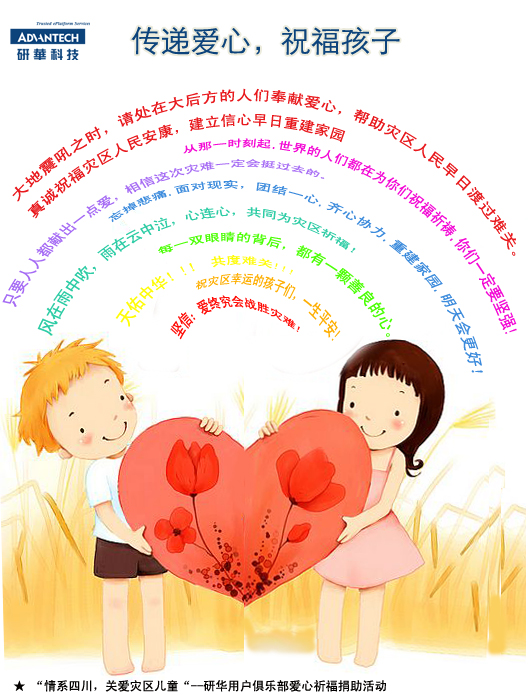 導語:研華用戶俱樂部啟動“情系四川,關愛災區兒童”愛心祈福捐助活動,呼吁全體工控人為災區的孩子們祈福