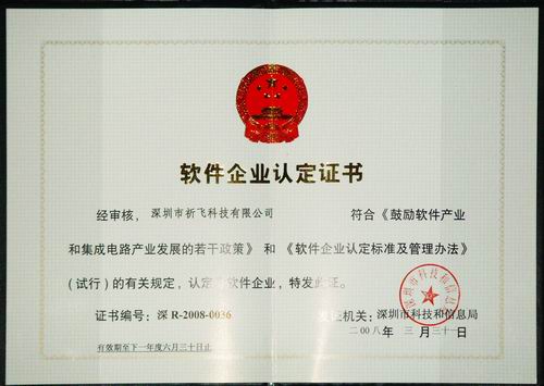 導語:祈飛科技榮獲“深圳市科技和信息局”頒發的軟件企業認定證書。