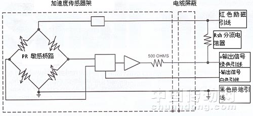 使用不擴大加速度傳感器的用戶非常熟悉分路校準或分路試驗。但對很多試驗專家以及用戶來說,這種分路能力需要擴大單元裝置(圖2)——并受限于所用的校準和試驗儀器。實質上,這種試驗可以使用戶通過安裝在結構上的裝置以電子模擬加速度的靜態變化,而這種模擬是通過用戶所選的具有預設值的分流電阻器合并輸出信號線與電壓電勢來實現的(圖5)。