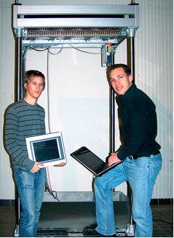 Christoph Utikal和Rainer Wagenhofer很驕傲的演示他們的水幕作品[/align]