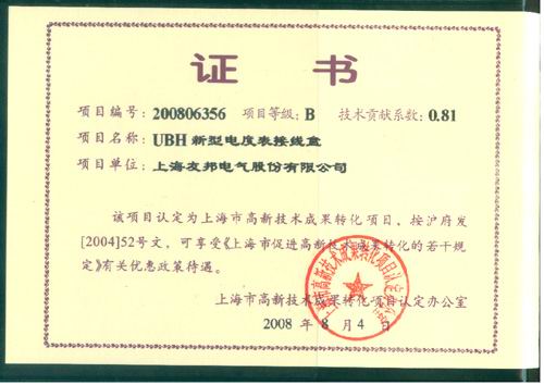 友邦電氣“UBH新型電度表接線盒”被評為“上海市高新技術轉(zhuǎn)化項目”