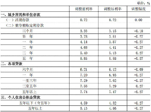 從2008年9月16日起,下調一年期人民幣貸款基準利率0.27個百分點,其他期限檔次貸款基準利率按照短期多調、長期少調的原則作相應調整;存款基準利率保持不變。