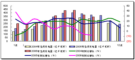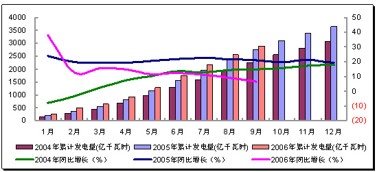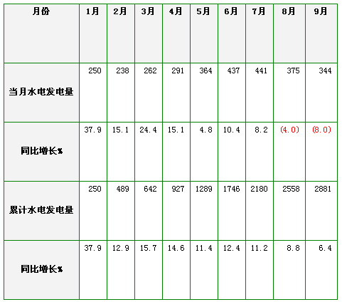導語:2006年9月,水電來水偏枯的情況仍在持續,同時受夏季用電高峰結束、用電量減少的影響,全國水電發電量同比和環比繼續下降。當月,全國共完成水電發電量343億千瓦時,同比減少8.0%,增速同比下降23.8個百分點。