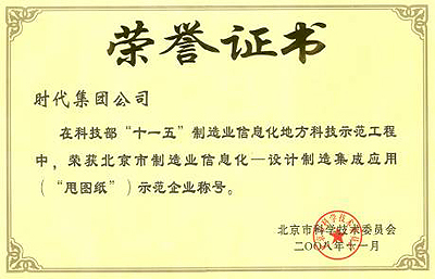 導(dǎo)語(yǔ):時(shí)代集團(tuán)在科技部“十一五”制造業(yè)信息化地方科技示范工程中,榮獲北京市制造業(yè)信息化——設(shè)計(jì)制造集成應(yīng)用(甩圖紙)示范企業(yè)稱號(hào)