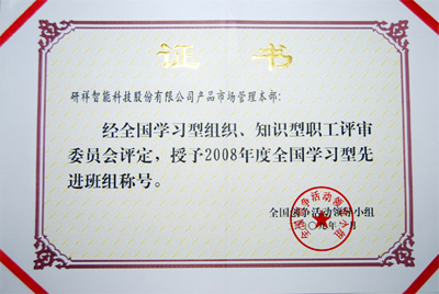 導(dǎo)語(yǔ):研祥集團(tuán)產(chǎn)品市場(chǎng)管理本部經(jīng)全國(guó)學(xué)習(xí)型組織、知識(shí)型職工評(píng)審委員會(huì)評(píng)定,被全國(guó)創(chuàng)爭(zhēng)活動(dòng)領(lǐng)導(dǎo)小組授予“2008年度全國(guó)學(xué)習(xí)型先進(jìn)班組”的榮譽(yù)稱號(hào)