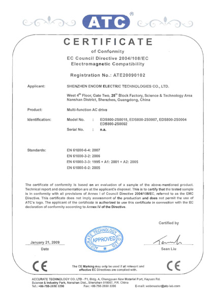 易能EDS800系列變頻器取得歐盟CE認(rèn)證證書(shū)