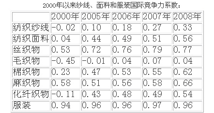 隨著紡織企業在自主創新和品牌發展上有長足的進步,從紗線、面料和服裝出口情況看,國際競爭力正不斷提高。這可以從這三大產品競爭力系數的變化情況看出。