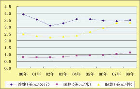 由近幾年出口增長情況看,出口增幅不斷下降,但面料、服裝出口平均價格不斷提升。2000年面料出口平均價格是每米0.79美元,服裝出口平均價格是每件2.51美元,到2008年面料和服裝已經分別達到每米1.12美元和每件3.32美元。由此可看出經過幾年努力,我國面料、服裝企業在技術創新、產品設計水平、企業品牌開發上都有大幅度提高,一批具有自主知識產權的原創性技術得到推廣應用,極大地促進了紡織面料的發展,服裝企業也正在創建自主品牌上不斷努力。