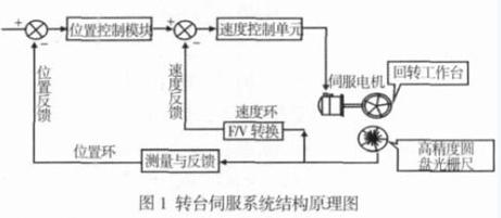 該控制系統由PC(上位機)、PMAC 控制器(下位機)、Dynaserv驅動器、PARK 的高精度旋轉工作臺、測量與反饋系統組成。其控制原理,如圖1 所示。PARK 的高精度旋轉工作臺與一般工作臺不同,它的電機是無刷直接驅動電機,回轉工作臺的臺面是電機的轉子,沒有了傳動機構,這樣就減少了傳動誤差。該系統是一個雙閉環系統,由于該系統中執行機構采用的是直接驅動電機,其雙閉環系統不同于通常的雙閉環,其速度環和位置環共用圓光柵位置反饋信號,內環是速度環,外環是位置環。速度環由速度控制單元、F/V 轉換、速度反饋電路組成,它可以實現速度恒值控制。位置環由PMAC 中位置控制模塊、速度控制單元、位置檢測及位置反饋電路組成。