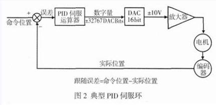 在系統中,為了獲得良好的穩態特性和動態特性,需要對系統的控制環進行校正和調整,所以當系統的基本特性(包括機械傳動、電機選型等)確立后,就需要對系統的控制環進行調整了。在以PMAC 為核心控制器的系統中,通過調節它提供的PID+速度/加速度前饋調節器的參數能解決大部分的系統特性問題,這些參數包括比例增益(proportional)、積分增益(integral)、微分增益(differential)(即PID 控制);速度、加速度前饋(feedforward);摩擦增益等等。典型PID 伺服環,如圖2 所示。