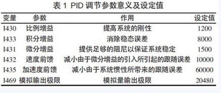 PID 調整必須在了解各參數的具體作用,并不斷的實驗,最好是先作脈沖響應調整,主要調整比例、積分、微分增益,在脈沖響應曲線調整最好的狀態下,不要更改比例、積分、微分增益,作正弦響應調整,正弦響應調整主要調整速度、加速度前饋和摩擦增益等參數,以下對轉臺空載的PID 進行調整,在經多次調整后我們得出了各參數的最優化設定值。各參數意義及設定值,如表1 所示。