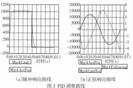 Pewin32 提供了兩種信號源(脈沖和正弦波信號)進行PID調整,脈沖響應過程主要是用來調整系統的P、I、D 等參數,而正弦波響應主要是用來調整系統的動態特性。PID 調整過程首先將所有運行的運動程序和PLC 程序停止,然后下載自己一段小程序,讓電機轉動,實時采集數據,繪制出脈沖或正弦響應曲線,讓用戶通過響應曲線來判斷系統的特性。