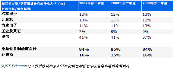 2009年第三季度意法半導體凈收入總計22.75億美元,包括并入意法半導體的ST-Ericsson的銷售收入。凈收入環比增長14%,反映了市場需求在意法半導體的所有目標市場上以及所有地區市場上恢復增長,特別是亞太地區和大中國區的市場需求更加強勁。公司在歐美市場的收入重拾升勢,反映了市場環境逐步回暖。因為商業環境不景氣,除亞太地區市場以外,在所有的目標市場和地區市場上,第二季度凈收入低于去年同期水平。