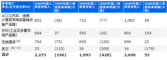 ACCI的 (汽車/消費電子/計算機/通信基礎設施產品部)第三季度凈收入環比增幅18%,達到8.52億美元,反映了隨市場情況開始好轉,計算機和汽車市場開始強勁增長。ACCI第三季度營業虧損3600萬美元,上個季度營業虧損7700萬美元,去年同期盈利5800萬美元。