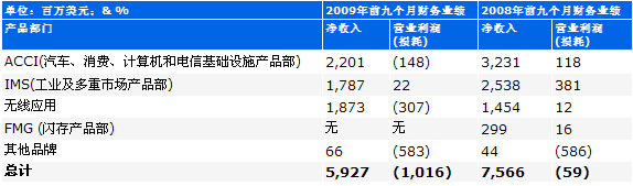 IMS(工業和多重市場產品部)第三季度凈收入環比增長17%,達到6.94億美元,反映了市場開始回暖,多重市場和經銷商渠道增長穩定。因為銷售額增加,IMS第三季度回到盈利狀態,實現營業利潤2700萬美元,上個季度營業虧損1600萬美元,IMS去年同期實現利潤1.54億美元。