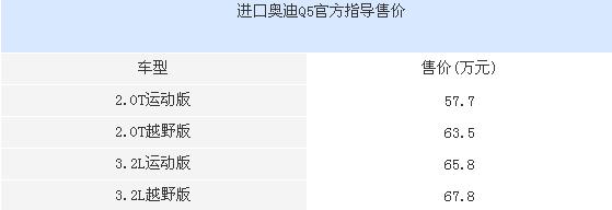 導語:奧迪中國29日宣布,進口奧迪Q5正式在中國市場上市,此次上市的新車有2.0TFSI、3.2FSI兩個排量,每個排量又分別有越野版和運動版(S-line)兩種車型,總計為兩個排量四款車型。