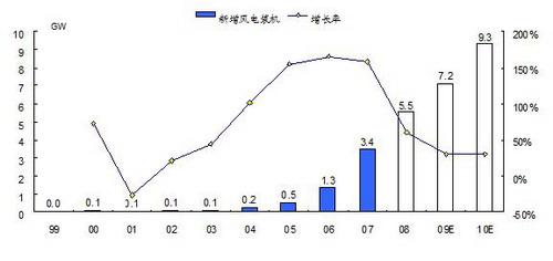 2009~2010年國內新增風電裝機將保持年均30%增長