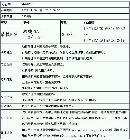導語:華晨因油箱通氣閥故障召回部分駿捷FRV轎車。