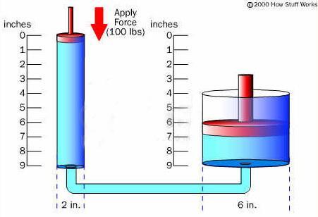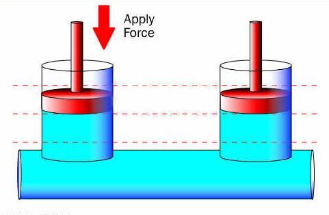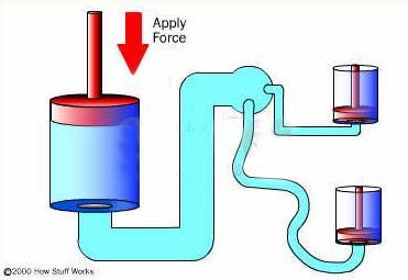 如圖:兩個活塞(紅色)裝在充滿油(藍色)的玻璃圓桶中,之間由一個充滿油的導管連接,如果你施一個向下的力給其中一個活塞(圖中左邊的活塞)那么這個力可以通過管道內的液壓油傳送到第二個活塞。由于油不能被壓縮,所以這種方式傳遞力矩的效率非常高,幾乎100%的力傳遞給了第二個活塞。液壓傳力系統最大的好處就是可以以任何長度,或者曲折成各種形狀繞過其他部件來連接兩個圓桶型的液壓缸。還有一個好處就是液壓管可以分支,這樣一個主缸可以被分成多個副缸,如圖所示: