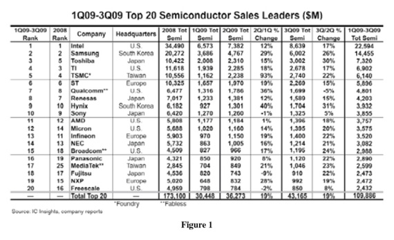 導語:基于前三個季度的整體銷售額,IC Insights評出了全球20大半導體廠商,英特爾仍排名首位,前三個季度銷售額為225.94億美元。三星位居第二,銷售額為144.56億美元