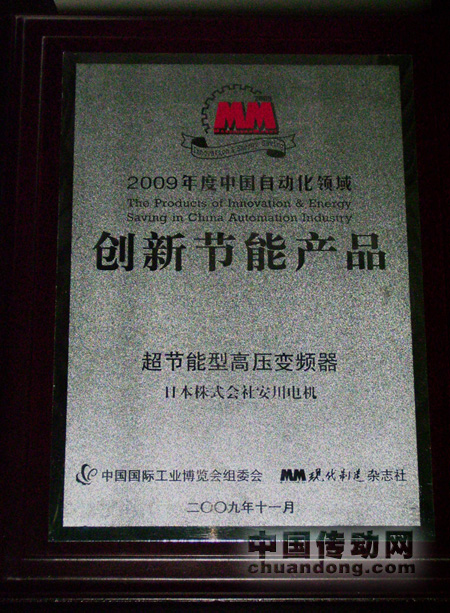 導語:安川電機上海)有限公司憑著高效率節能的FSDrive-MV1S高壓變頻器在眾多參選產品中脫穎而出,一舉獲得了“2009MM新自動化創新節能產品”獎