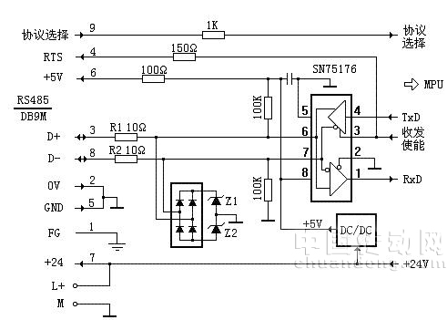 采用隔離的DC/DC將24V電源和5V電源隔離,我們分析了三菱、歐姆龍、施耐德PLC以及西門子的PROFIBUS接口均是如此。
