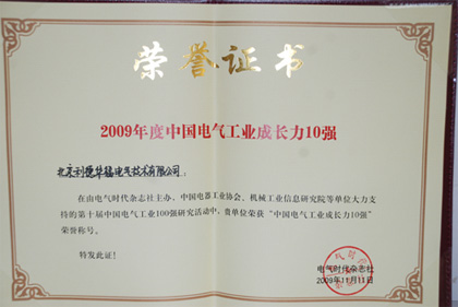 利德華福榮獲“2009年度中國電氣工業成長力10強”企業