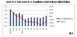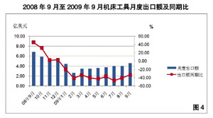 圖3顯示出:從2008年下半年開始至2009年9月份,機(jī)床平均單價(jià)增速在加快,特別是2009年上半年,比一年前平均增加了10多個(gè)百分點(diǎn)。