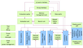 這款PowerPC 476FP的時鐘頻率超過1.6GHz,并可達到2.5 Dhrystone MIPS/MHz性能。相較于IBM現有嵌入式內核PowerPC 464FP,其在性能方面有超出兩倍的表現,PowerPC 476FP定位為于SoC設計的最高性能嵌入式處理器內核。