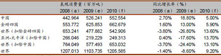 世界鋼協(xié)預(yù)測(cè)2010 年世界鋼材表觀需求將恢復(fù)到12.1 億噸,接近2008 年水平,全球鋼需求的恢復(fù)程度已超過(guò)了在今年4 月份的預(yù)計(jì)。按照目前的預(yù)測(cè),09 年世界鋼表觀消費(fèi)量將為11 億噸,同比仍降8.6%,而2010 年則增長(zhǎng)到12.07 億噸,較2009 年增長(zhǎng)9.2%;
