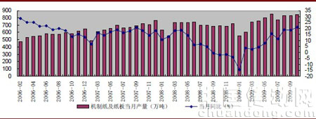 造紙行業全國及紙板月產量同比增速自08年5月開始大幅下降,08年9月—09年1月當月產量皆為負增長,今年1月份同比負增長達14.39%,2月份后由于下游庫存減少,需求開始回升,2月份后產量逐月回升,至10月份單月產量已達845.20萬噸,同比增長已逐步提高到21.01%;1-10月份累計產量7582萬噸,同比增長10.67%。