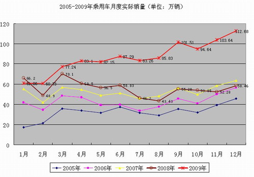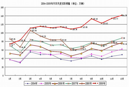 導語:2004-2009年汽車、乘用車、商用車月度實際銷量對比。