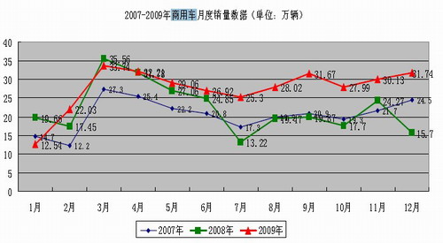 2004-2009年汽車、乘用車、商用車月度實際銷量對比圖: