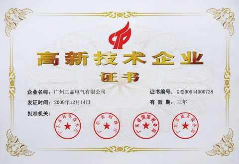 熱烈慶祝廣州三晶電氣有限公司榮獲由廣東省科技廳、廣東省財政廳、廣東省國家稅務局、廣東省地方稅務局于2009年12月聯合頒發的“高新技術企業”證書。