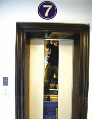 按這幢樓電梯,電梯不動,耳朵貼上面聽,電梯井里叮叮當當的。爬到4樓,電梯張開一下,又合上了,看到工作人員正在里面埋頭維修。