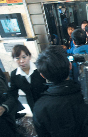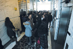 圖片說明:上百名大廈內的工作人員在大廳內等待乘坐電梯。