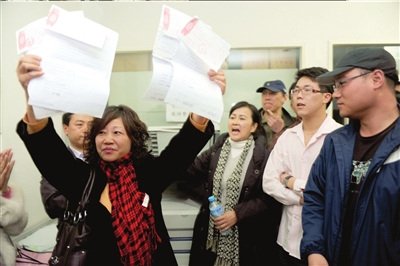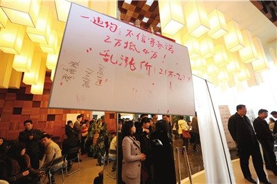 昨天上午10點,記者在北京像素售樓大廳看到,有人已將房產宣傳廣告涂滿“告開發商”及“欺詐”等標語,現場上千人高舉選房申請書,齊聲呼喊,要求售樓方給予相應解釋。