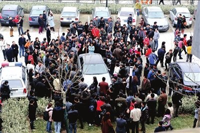 開發商一代表坐在奔馳車內不敢出來,上百名購房者將其圍住