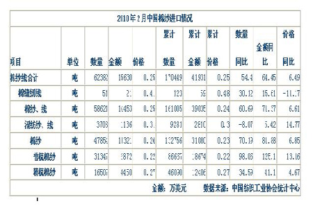 導(dǎo)語(yǔ):2010年2月中國(guó)進(jìn)口棉紗線達(dá)62382噸,進(jìn)口金額達(dá)15630萬(wàn)美元;