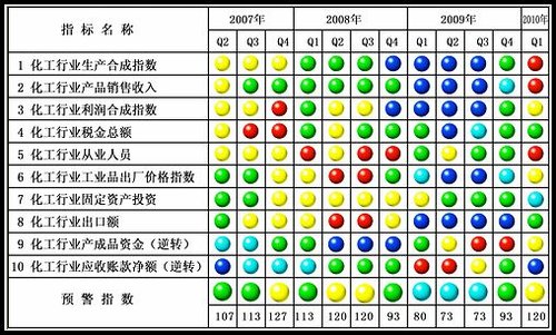 2010年一季度,中經化工行業預警燈號由綠色變為黃色,表示化工行業運營狀況由正常轉變為偏熱。