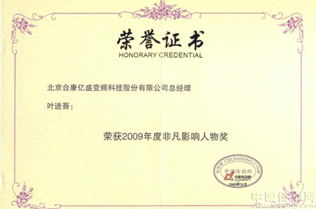 合康變頻總經(jīng)理葉進(jìn)吾先生 榮獲2009年度非凡影響力人物獎(jiǎng)