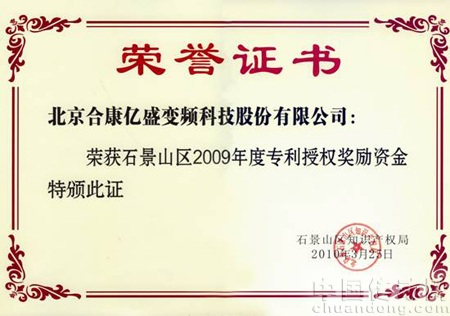 合康變頻喜獲石景山區(qū)2009年度專利授權(quán)獎(jiǎng)勵(lì)資金