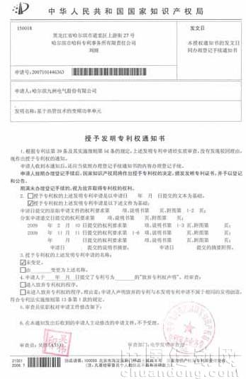 2009年,九洲電氣通過高效整合資源、加大科技研發力度、積極打造創新團隊,在技術創新方面取得了卓有成效的發展,僅09年一年就申請專利34項。截止到目前,申請的專利已全部獲得受理,其中發明專利受理9項,實用新型專利受理25項。這些專利對于進一步提升九洲電氣產品的科技含量,增強企業在電力電子市場競爭的技術優勢都有著積極而重要的意義。