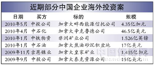 在外部條件上,中國率先在金融危機后復蘇,使更多國家看到了中國的實力,向中國敞開了投資的大門。加拿大就是其中一例。過去幾年,加拿大政府并不鼓勵中國投資者,但在金融危機后加拿大礦業投資政策在悄然發生著改變,加拿大滑鐵盧大學地球與環境科學系教授徐寶慈告訴記者,長期以來,加拿大一直是美國重要的資源“后院”,金融危機爆發后,加拿大的礦產供給已大大多于美國的需求,必須找到新的出路。加拿大近年提高了外國投資者可持股比例,并且提供了較低的企業稅。據加拿大魁北克投資局介紹,2010年其聯邦稅和省稅合計稅率為29.9%。