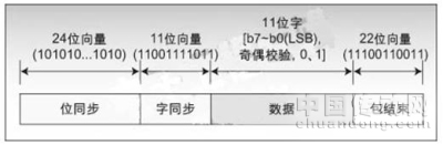 圖1是專為可靠性進(jìn)行設(shè)計(jì)的CEA-179數(shù)據(jù)包格式。該數(shù)據(jù)包和位的邊界是用于位同步的24位向量,后面是指示數(shù)據(jù)起始位的11位字同步信號(hào)。發(fā)送器將每8位指令編碼成一個(gè)11位的字,在接收器側(cè)再將其解碼并移位至存儲(chǔ)器緩存。在PLC中,指令數(shù)據(jù)還增加了16位的循環(huán)冗余校驗(yàn)碼(CRC),EOP則使用重復(fù)的11位字進(jìn)行識(shí)別。因此,CEA-179協(xié)議與BPSK和FSK的結(jié)合可確保穩(wěn)健的PLC傳輸,并能為多節(jié)點(diǎn)的實(shí)時(shí)控制提供足夠的帶寬。